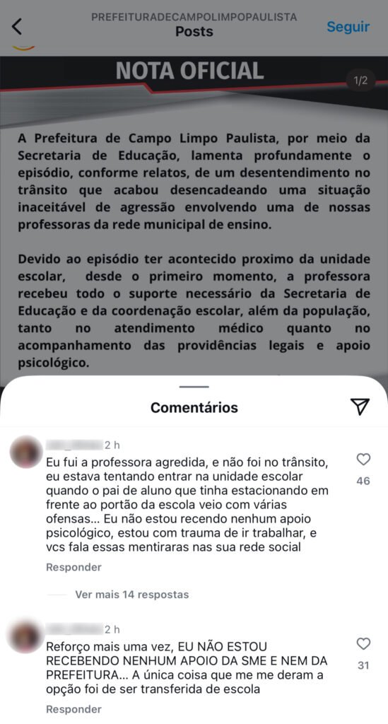 Para nossa surpresa, a própria professora comentou na publicação desmentindo a nota oficial da prefeitura de Campo Limpo Paulista, dizendo que não recebeu nenhum apoio e que apenas foi questionada se desejava mudar de escola.