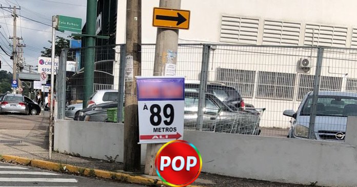 A imagem mostra uma placa de propaganda dizendo “gás a 89 metros”, que foi colocada na Avenida Fernão Dias, próximo ao supermercado Coopercica, no bairro Vila Santa Terezinha, em Várzea Paulista.