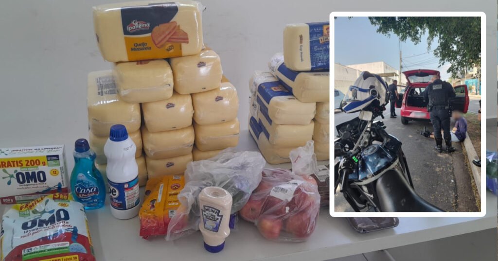 No veículo, havia três pessoas: duas mulheres e um homem, além de diversos itens furtados dos estabelecimentos, cerca de R$5 mil em mercadorias.