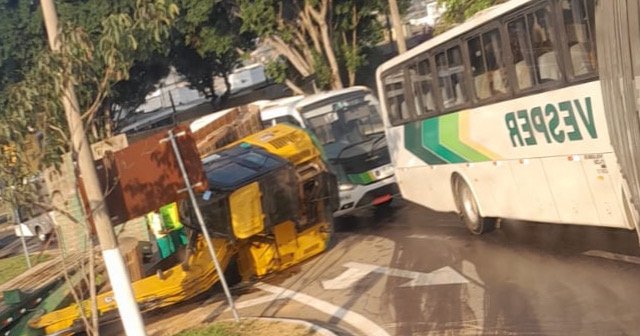 Retroescavadeira que estava sendo transportada tomba em frente ao Terminal Hortolândia.