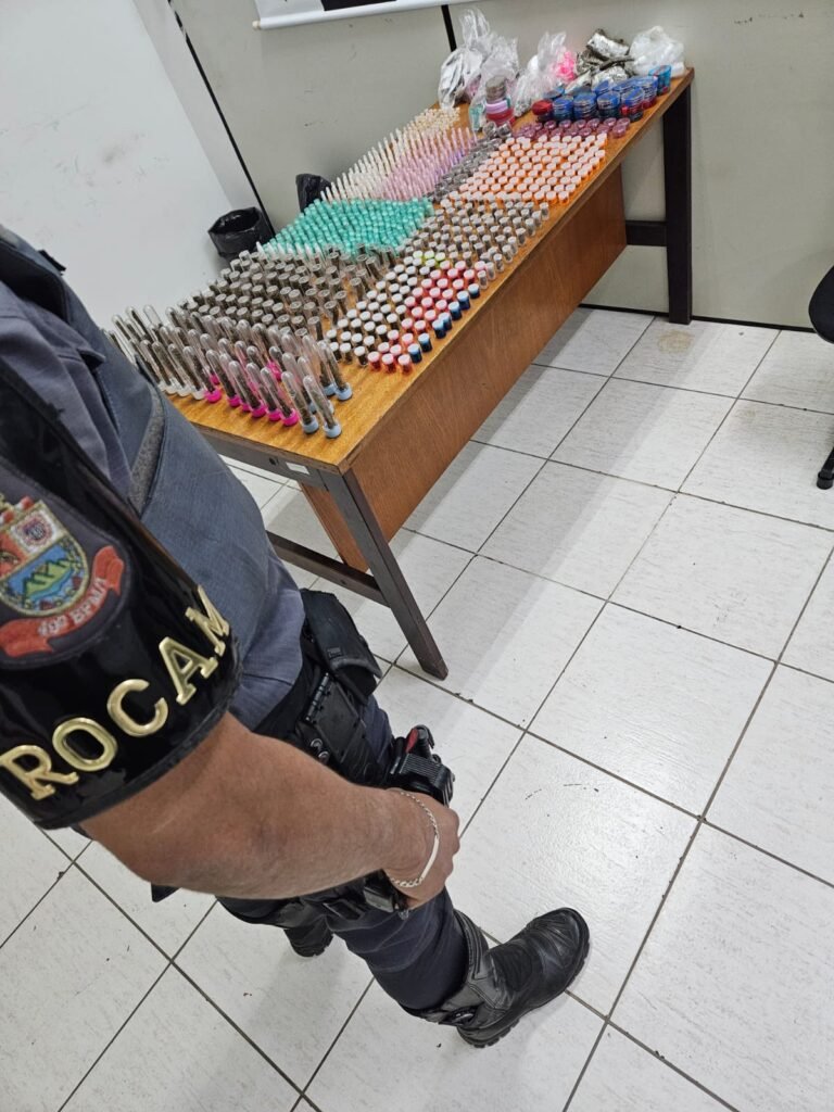 A equipe patrulhava pelo bairro Jardim América III, próximo a um local conhecido pela venda de entorpecentes, quando avistou dois indivíduos na calçada com sacolas em mãos. Ao notar a aproximação das motos da Rocam, tentaram sair correndo, mas foram detidos.