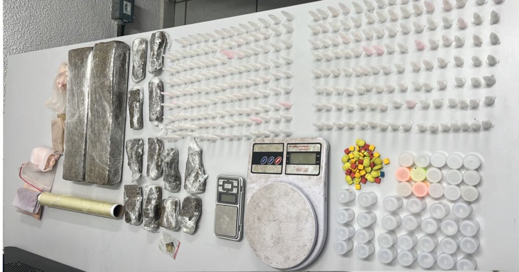 No imóvel, foram encontrados diversos tipos de drogas, incluindo maconha, cocaína, ecstasy e metanfetamina, além de balanças de precisão e embalagens utilizadas para o fracionamento e venda dos entorpecentes.
