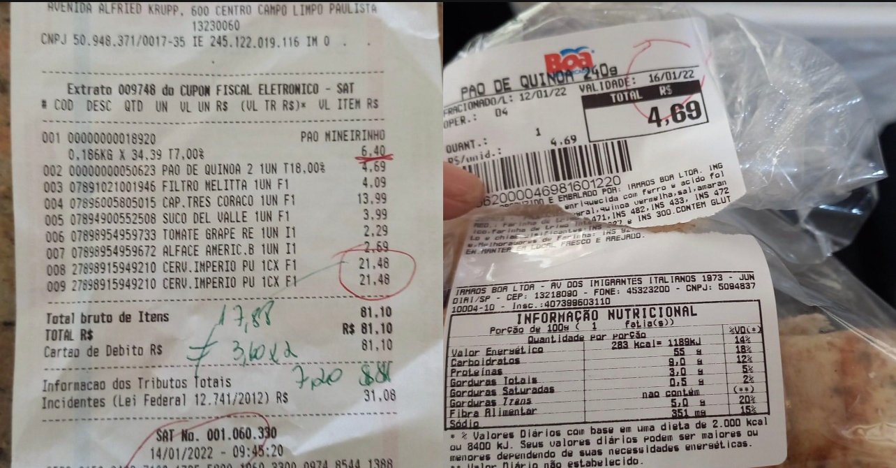 Segue foto do pão, nota fiscal e foto do preço anunciado no mercado.