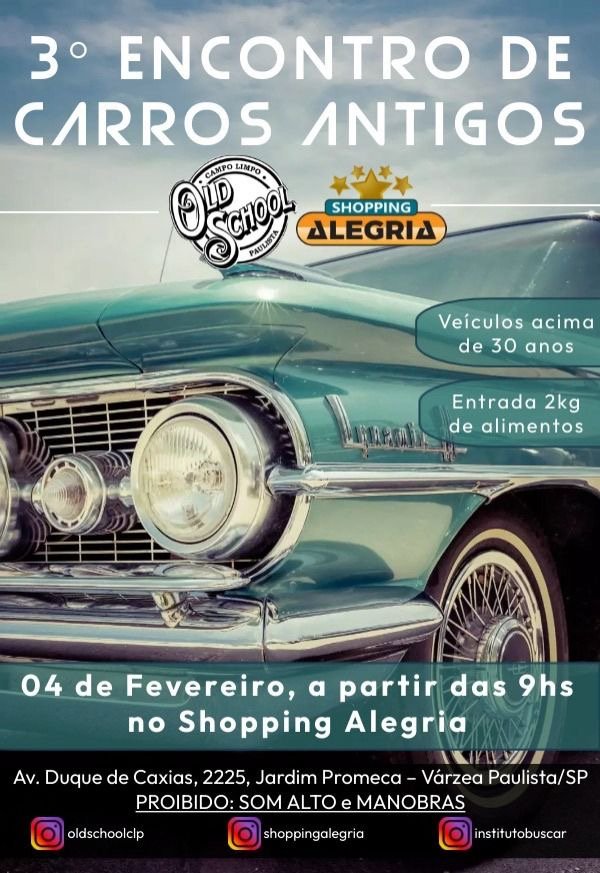 Neste domingo (04), o Shopping Alegria, em Várzea Paulista, será palco do 3º Encontro de Carros Antigos.
