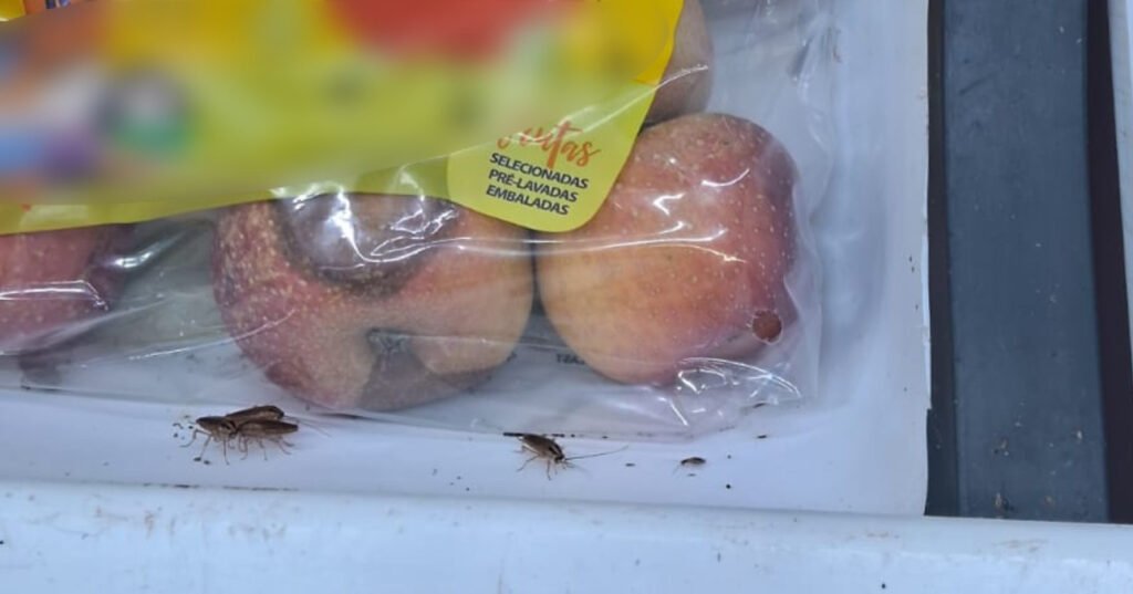 Ela foi até um atacadista em Várzea Paulista e, ao passar pela seção de hortifruti, acabou flagrando alguns insetos próximos das maçãs.