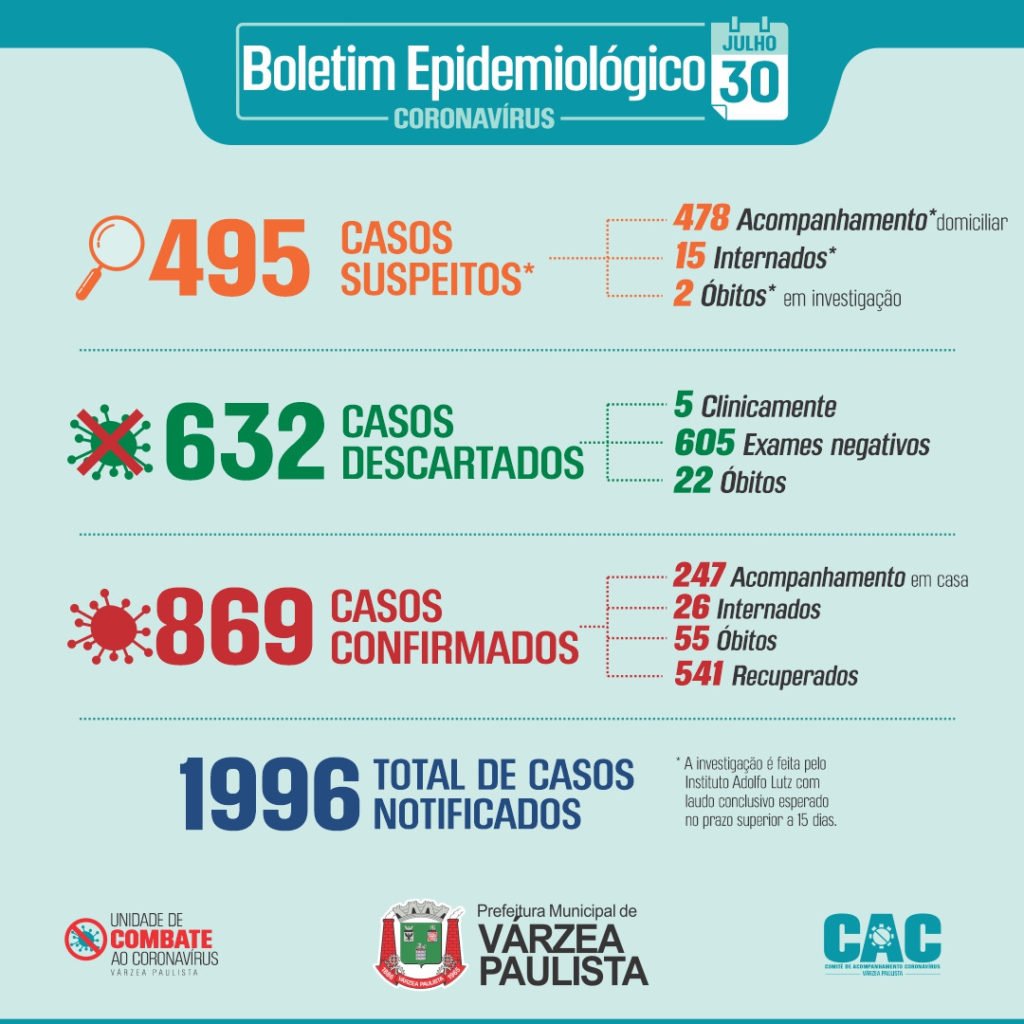 SaúdeVárzea Paulista Sobe para 55 número de mortes por Covid-19 em Várzea Paulista por O estagiário atualizado 31/07/2020 A cidade de Várzea Paulista, registrou mais um óbito por Covid-19, nesta quinta-feira (30). Trata-se de um Homem de 76 anos de idade. Município já registra 869 casos do Novo Coronavírus. Coronavírus