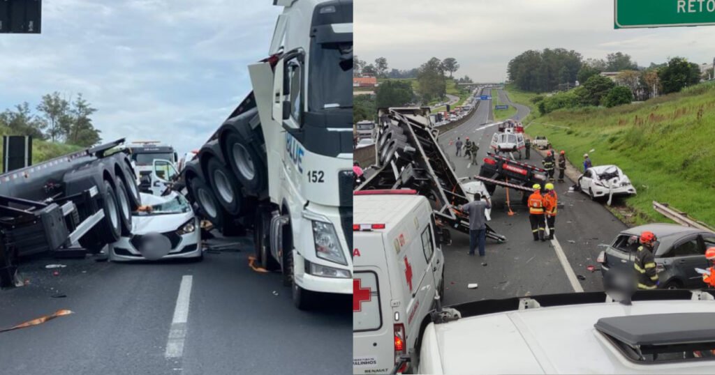 Três veículos e uma carreta se envolveram em um grave acidente na Rodovia Anhanguera.