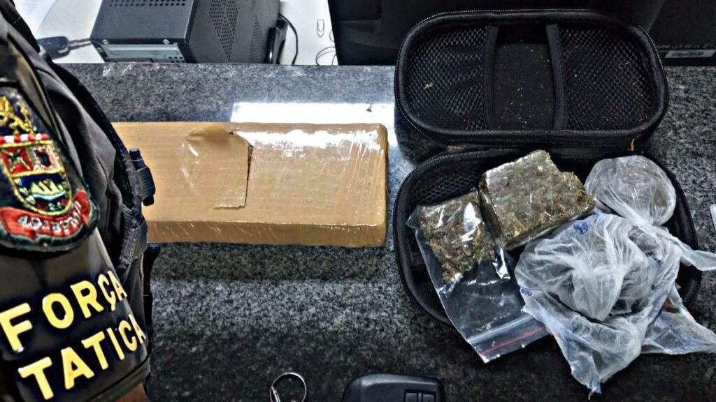 Durante a busca veicular, foi localizado um tijolo de maconha e algumas porções fracionadas.