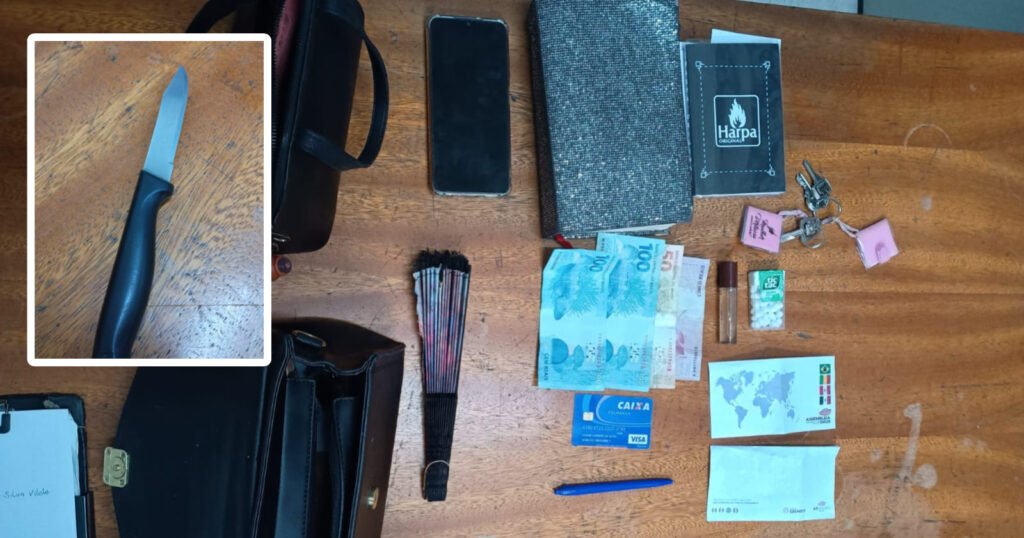 A equipe realizou a abordagem, onde foram localizadas duas bolsas femininas, um celular, R$250 em dinheiro e outros objetos, além de uma faca utilizada no crime.