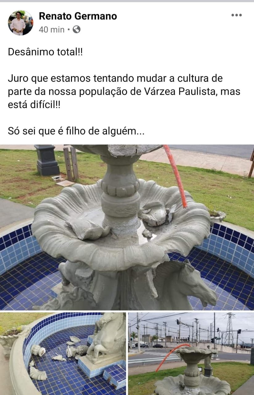 O gestor de Infraestrutura Renato Germano, postou um desabafo em suas redes sociais. A população espera que a fonte seja reformada novamente.