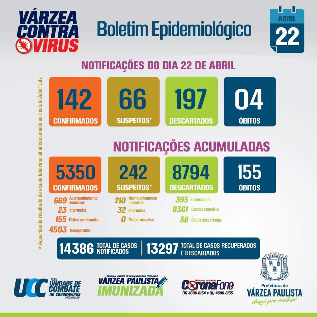 A Prefeitura de Várzea Paulista divulgou mais um boletim epidemiológico, nesta quinta-feira (22).