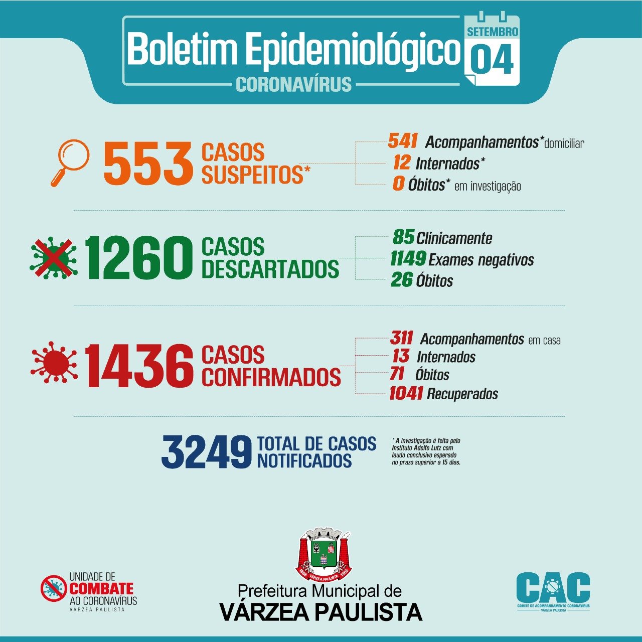 Várzea Paulista Várzea Paulista fecha a semana sem mortes por Covid-19 por O estagiário atualizado 04/09/2020 Prefeitura de Várzea Paulista divulgou mais um Boletim Epidemiológico, nesta sexta-feira (04). A boa notícia é que o município segue sem registrar óbitos por Covid-19. CoronavírusVárzea Paulista