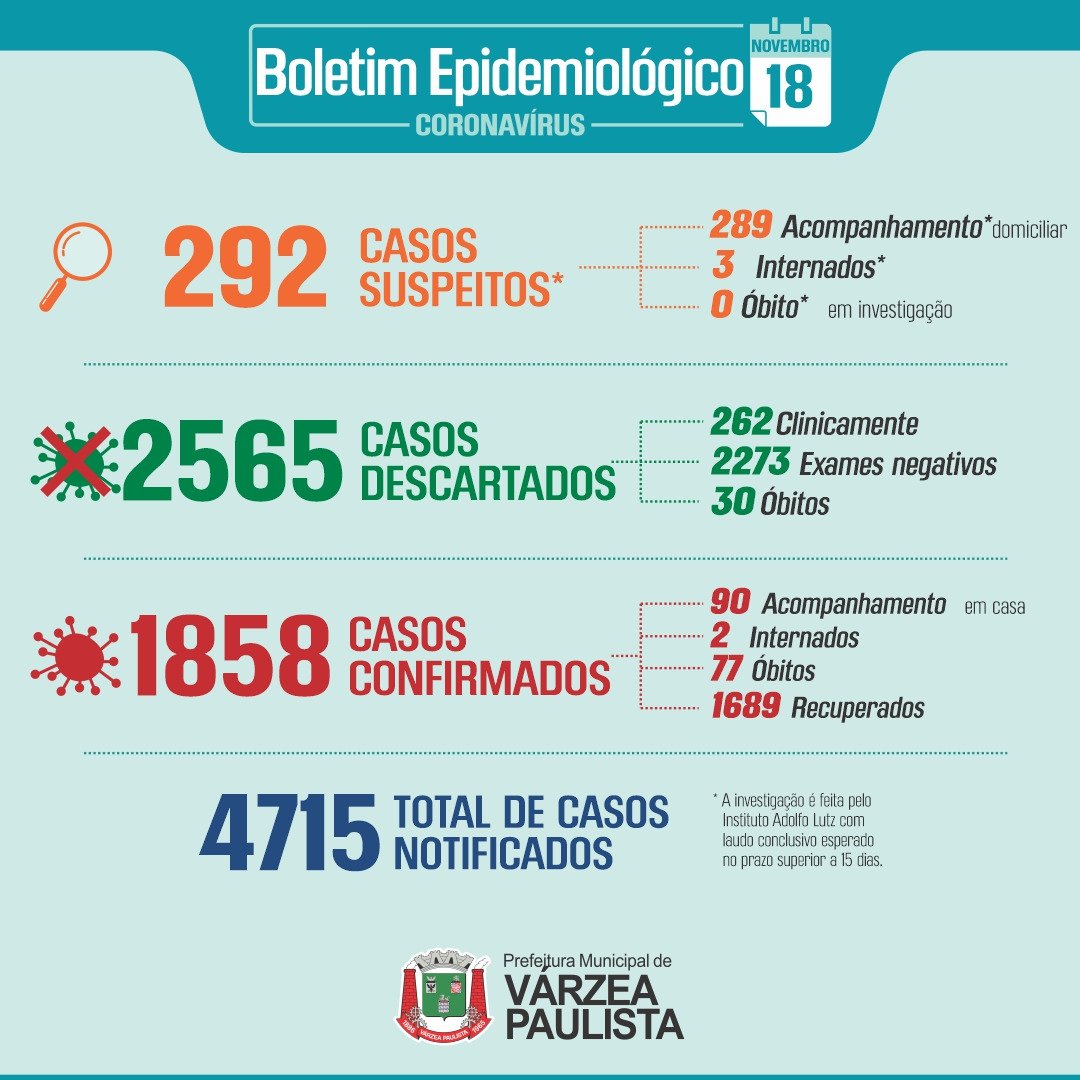 A Prefeitura de Várzea Paulista divulgou mais um Boletim Epidemiológico, nesta quarta-feira (18). Já são quase 1 mês sem registrar novos óbitos por Covid-19, na cidade.