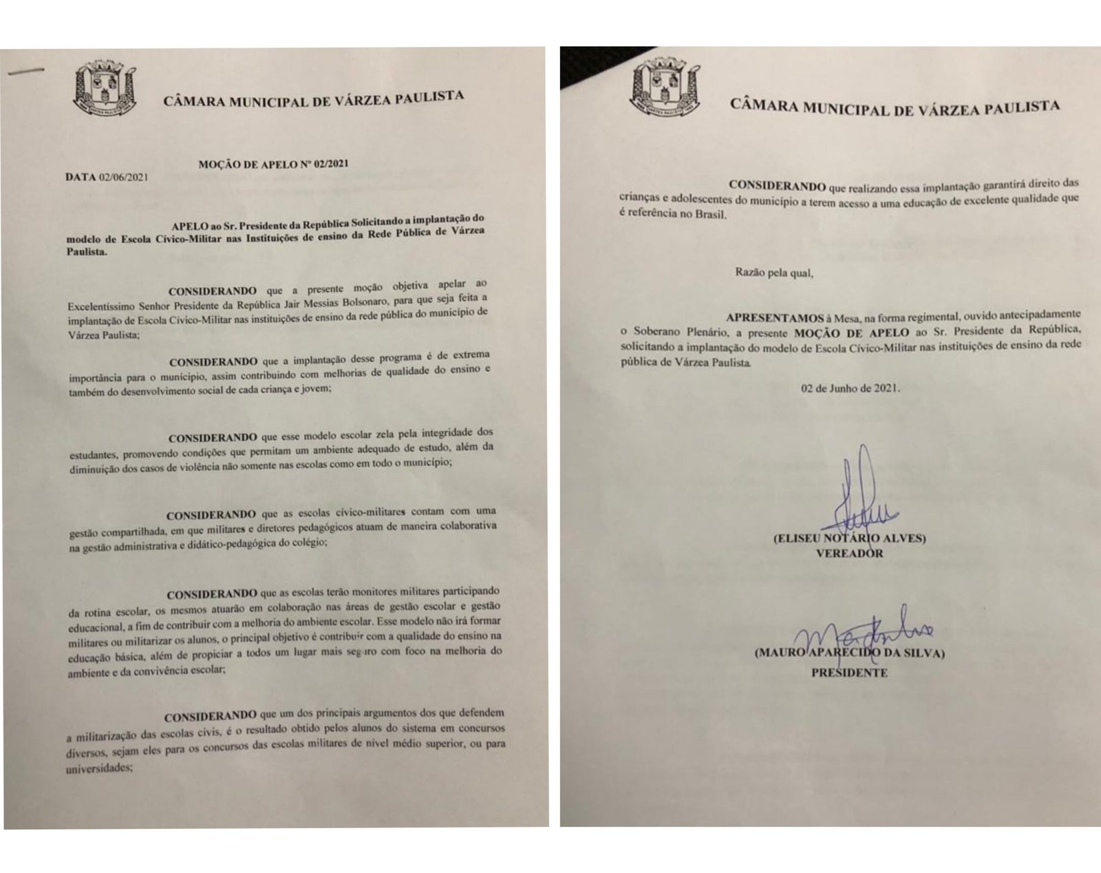 Os vereadores pedem a implantação de uma Escola Cívico-Militar no município de Várzea Paulista, uma vez que o presidente tem o desejo de realizar a implantação desse modelo de ensino em todo o país