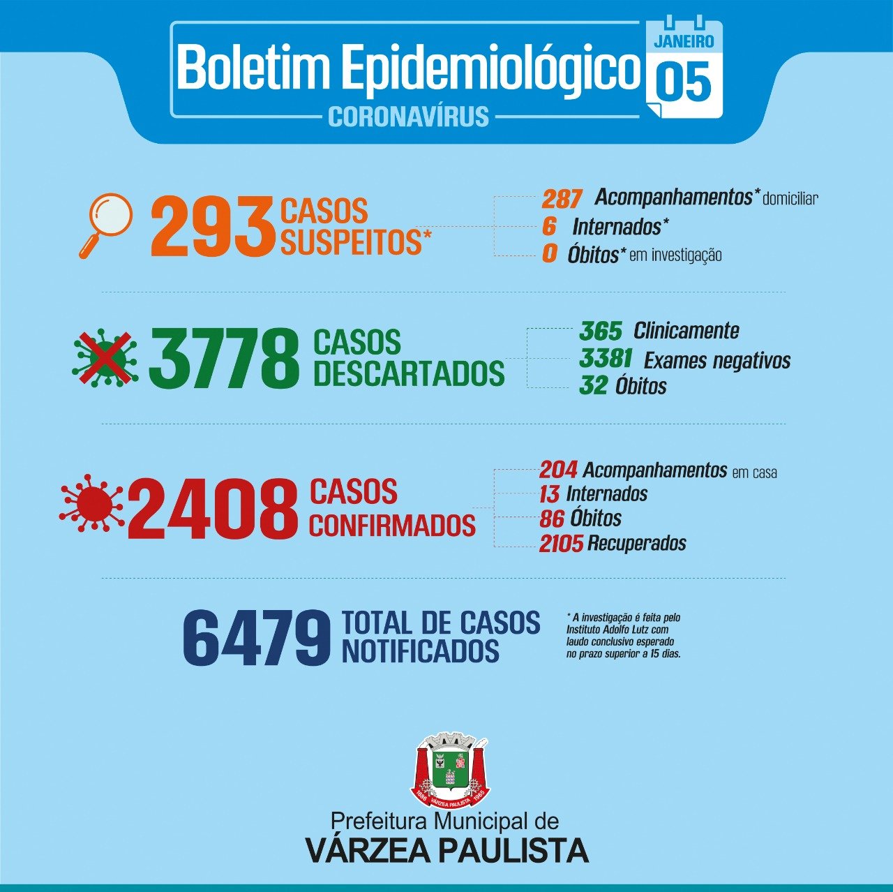 Nesta terça-feira (05) a Prefeitura divulgou mais um Boletim Epidemiológico. Segundo informações, entraram 106 casos novos.