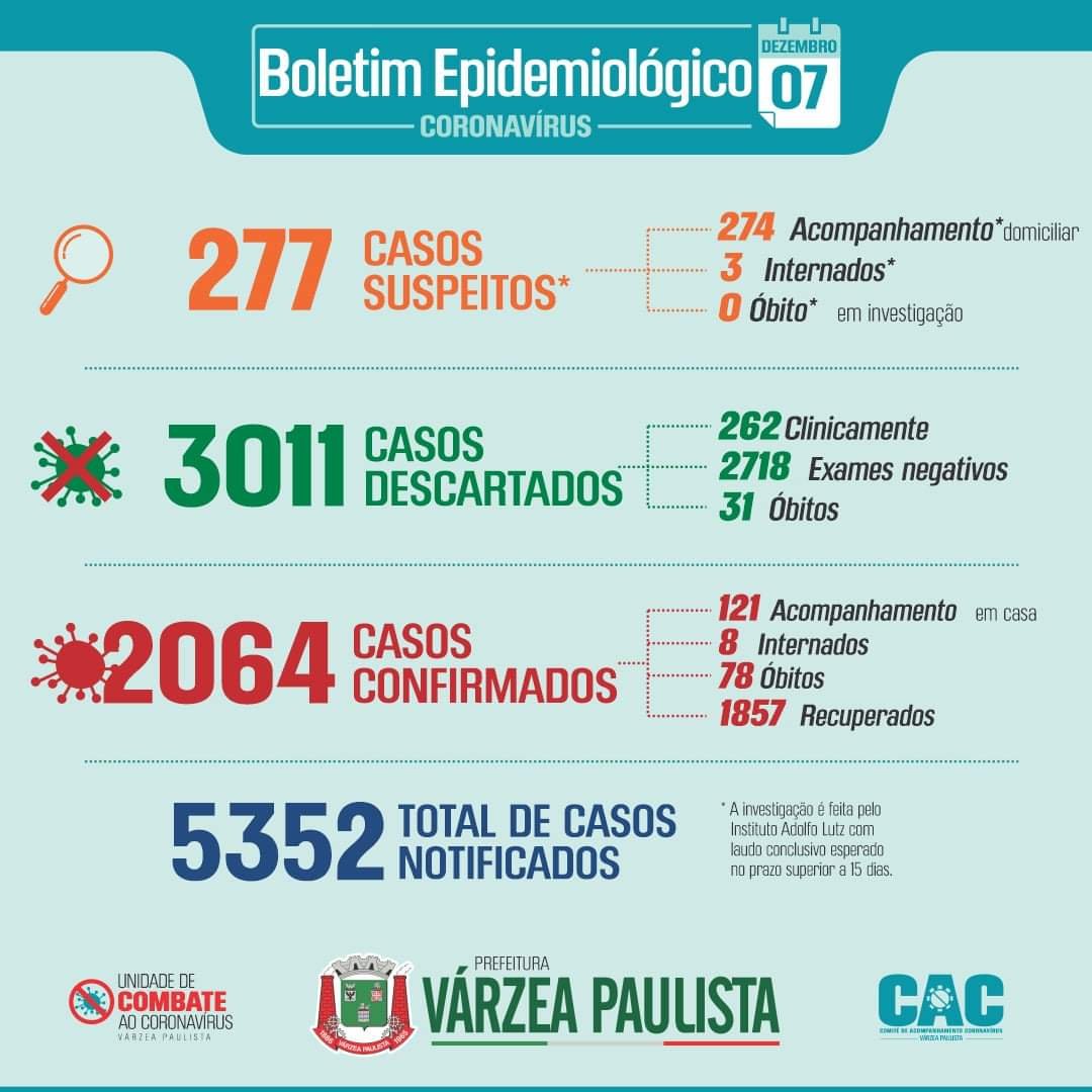 Várzea Paulista Várzea Paulista registrou 34 novos casos positivos de Covid-19 CORONAVÍRUS por O estagiário atualizado 07/12/2020 A Prefeitura de Várzea Paulista divulgou mais um Boletim Epidemiológico, nesta segunda-feira (07). Desde o último boletim, a cidade registrou 34 novos casos positivos e 62 casos negativos (descartados). Coronavírus