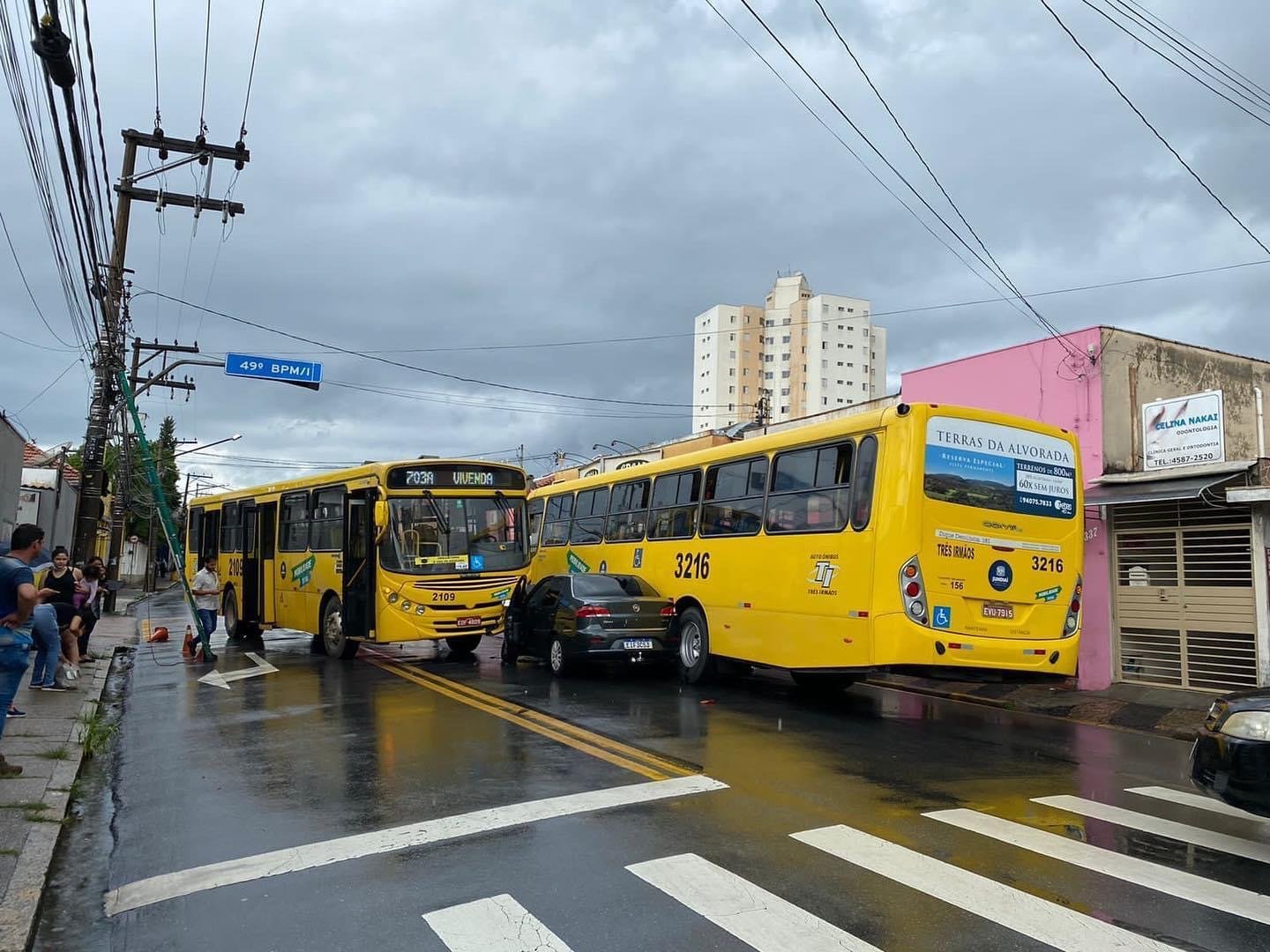 Na tarde desta quarta-feira (05), ocorreu um acidente na rua Barão do Rio Branco, na Vila Arens, envolvendo um carro e dois ônibus.