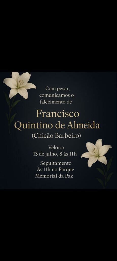 Jundiaí Vila Hortolândia perde o Chicão Barbeiro por O estagiário em 12/07/2025 Neste sábado (12), a cidade de Jundiaí amanheceu de luto. Morreu, aos 63 anos, Francisco Quintino de Almeida, mais conhecido como Chicão Barbeiro. Chicão Barbeiro será sepultado amanhã (13) no Cemitério Parque Memorial da Paz, das 8 às 11 horas.