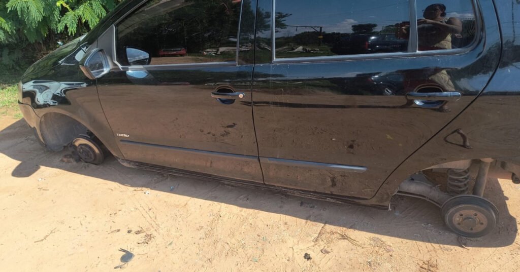 Ele embarcou no trem por volta das 9 horas; quando retornou às 13 horas, seu veículo estava sem as quatro rodas.