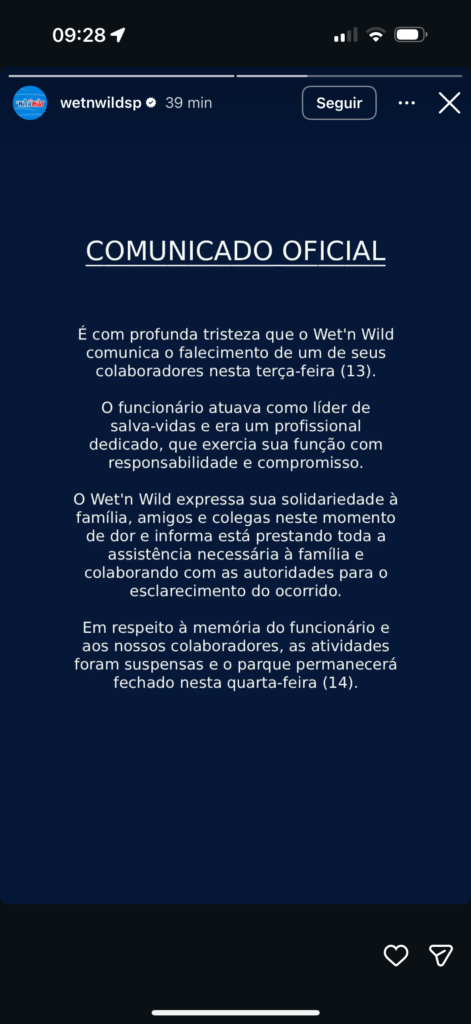 Ainda de acordo com o comunicado, o Wet’n Wild informou que está prestando toda a assistência necessária aos familiares e colaborando com as autoridades para o esclarecimento do ocorrido. Em respeito à memória do colaborador e aos demais funcionários, as atividades foram suspensas e o parque permanece fechado nesta quarta-feira (14).